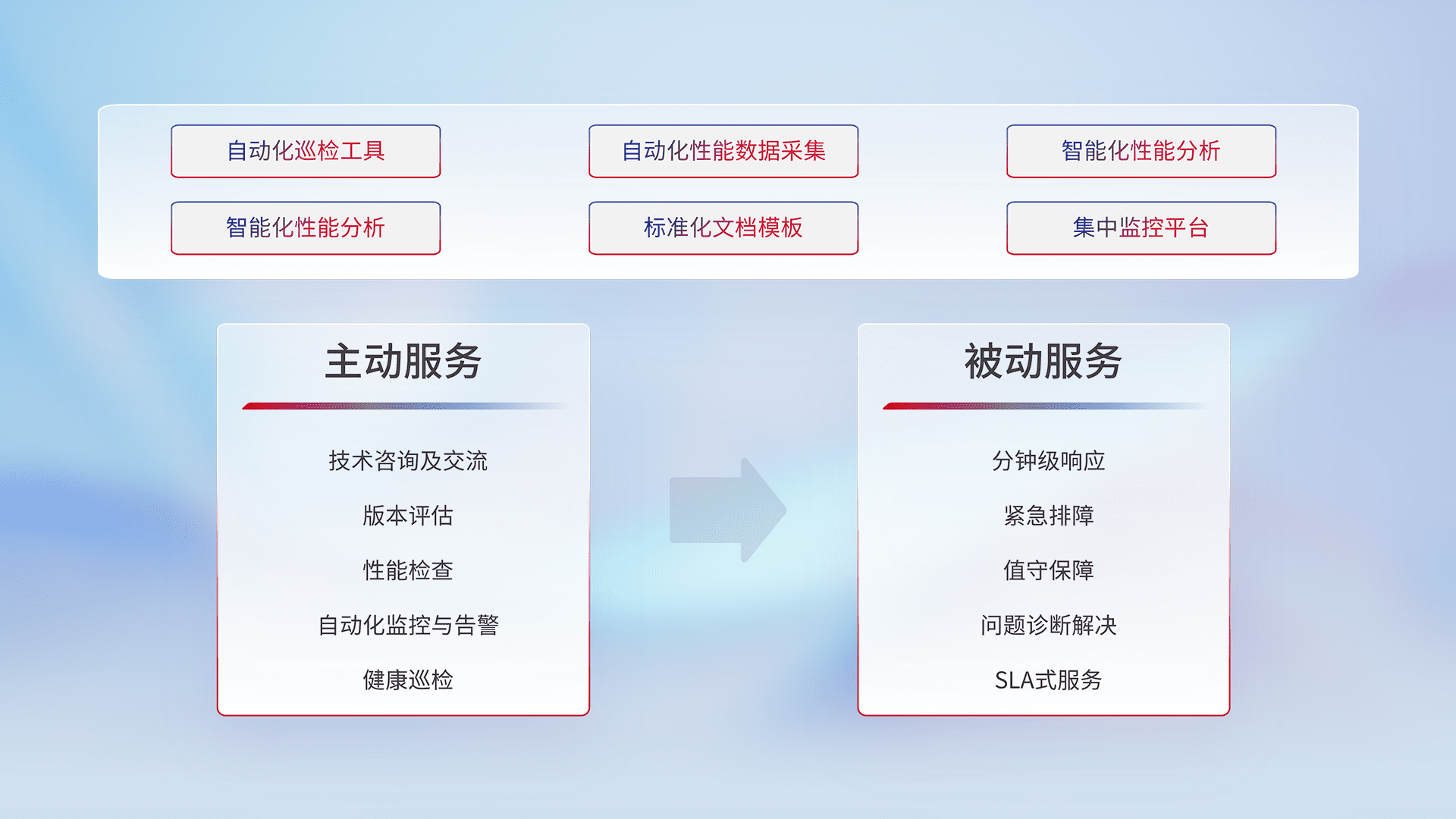 智能化工具和标准化文档,,,保障服务质量,,,提供主动服务(包含技术咨询、、版本评估、、性能检查、、、自动化监控与告警、、、、健康巡检)和被动服务包含(分钟级响应、、、紧急排障、、、、值守保障、、问题诊断解决、、、、SLA服务)。。。。